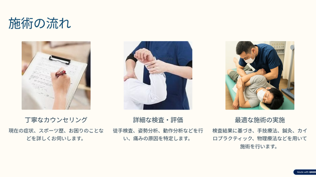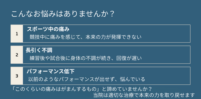 痛みの改善だけでなく、スポーツ復帰後のパフォーマンス向上にも力を入れています。正しい体の使い方や動作指導、テーピングやフォームチェックを通じて、より高いレベルでのプレーをサポートします。